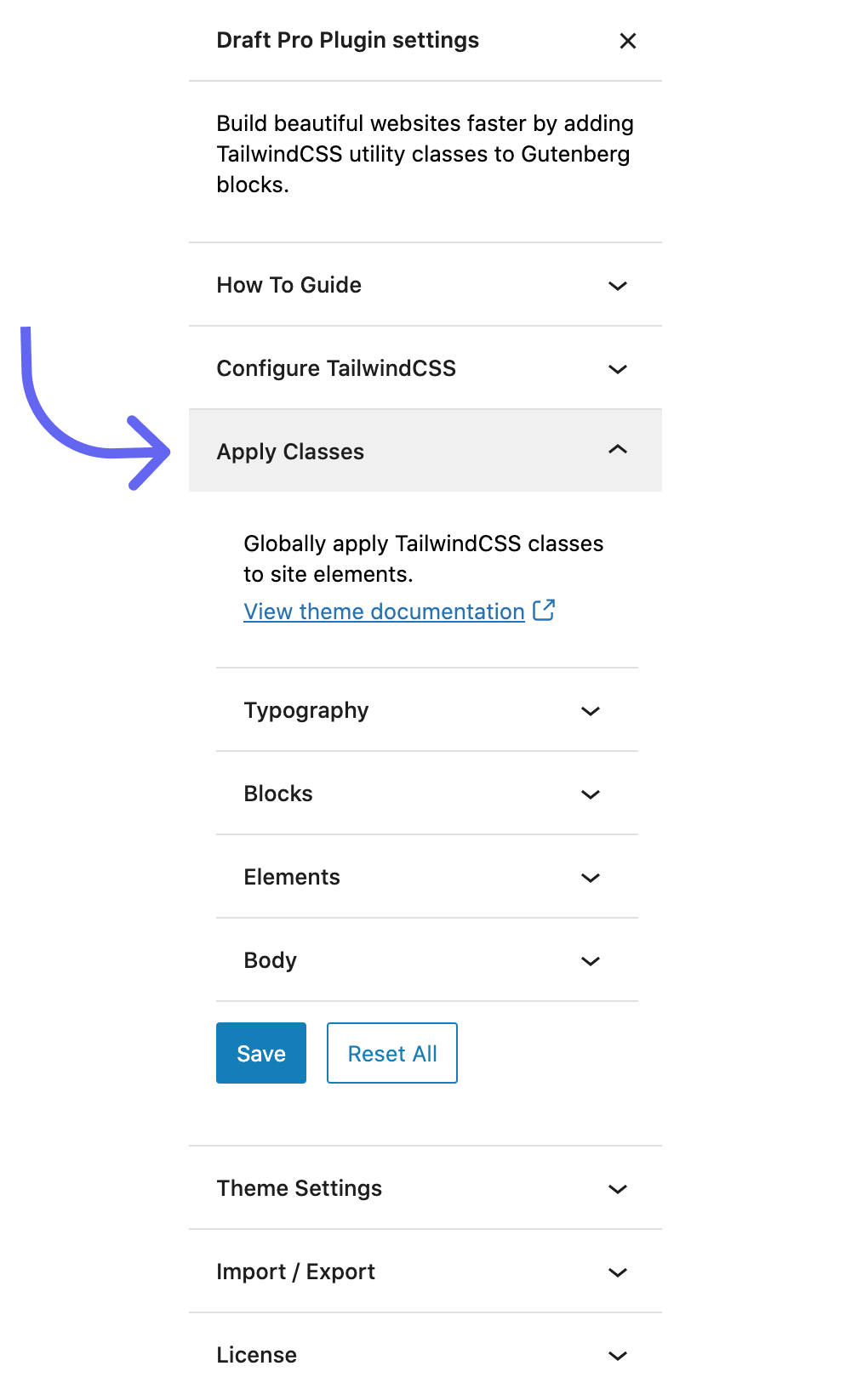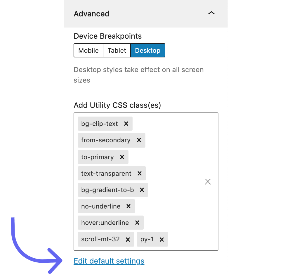 The ‘Apply Classes’ settings function much like the TailwindCSS @apply directive. You can apply utility classes globally to Typography elements ( such as paragraph tags, links, h1-h6 tags etc. ), Gutenberg blocks ( such as buttons, images, tables, etc. ), HTML elements ( such as buttons, images, etc. ), and to the Body of your website.