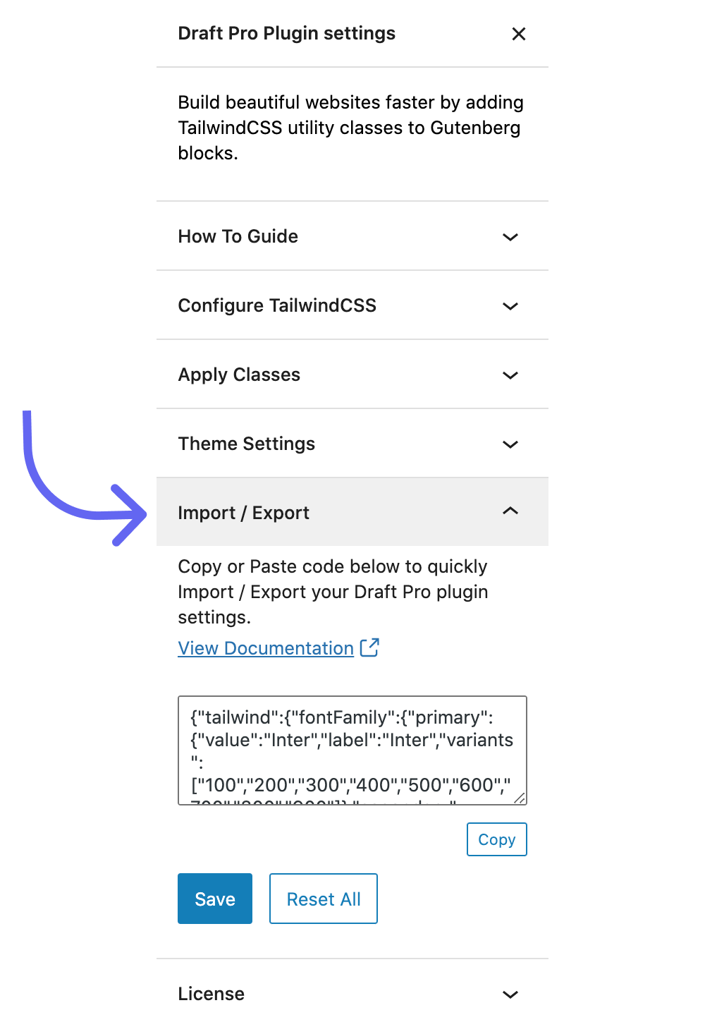 Welcome to what is probably our favorite plugin setting, Import / Export. Import / Export gives you the ability to easily move TailwindCSS configurations, Applied Classes, and Theme Settings between sites 🤯. It seriously feels like magic.